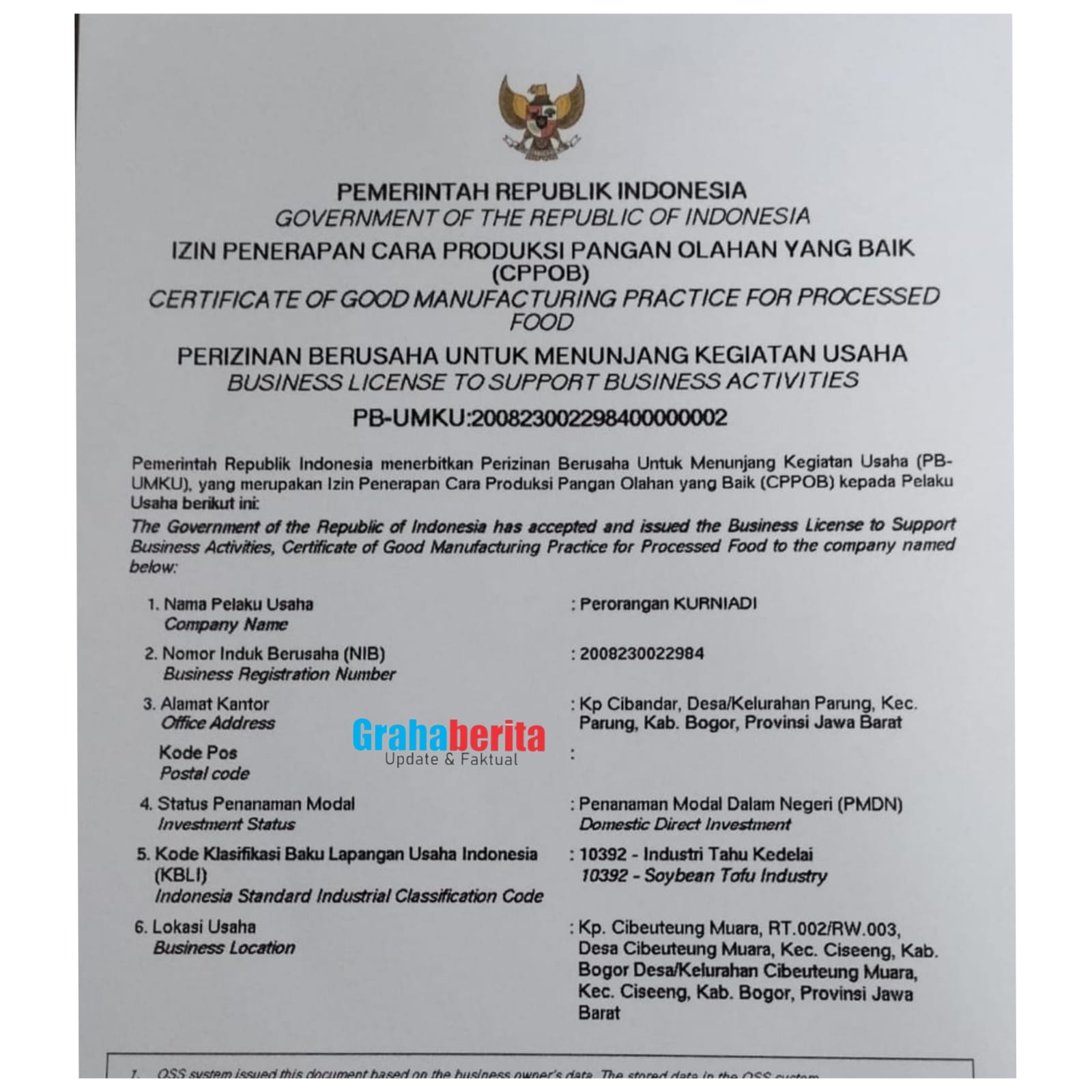 Secara bertahap perijinan sudah di urus seperti, ijin CPPOB ( Cara pengolahan pangan olahan yang baik ) dari BPOM, Hasil Uji Laboratorium dari Labkesda Kabupaten Bogor terkait mutu air dan tahu hasilnya baik, Hasil IKL dari Puskesmas Kecamatan Ciseeng, Tahu Sutra 77 Binaan Dinas UMKM dan Koperasi Kabupaten Bogor, yang lainnya masih dalam proses. (@N)