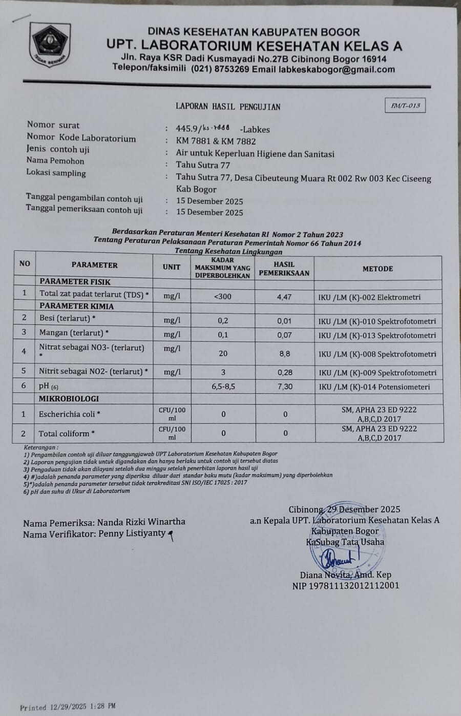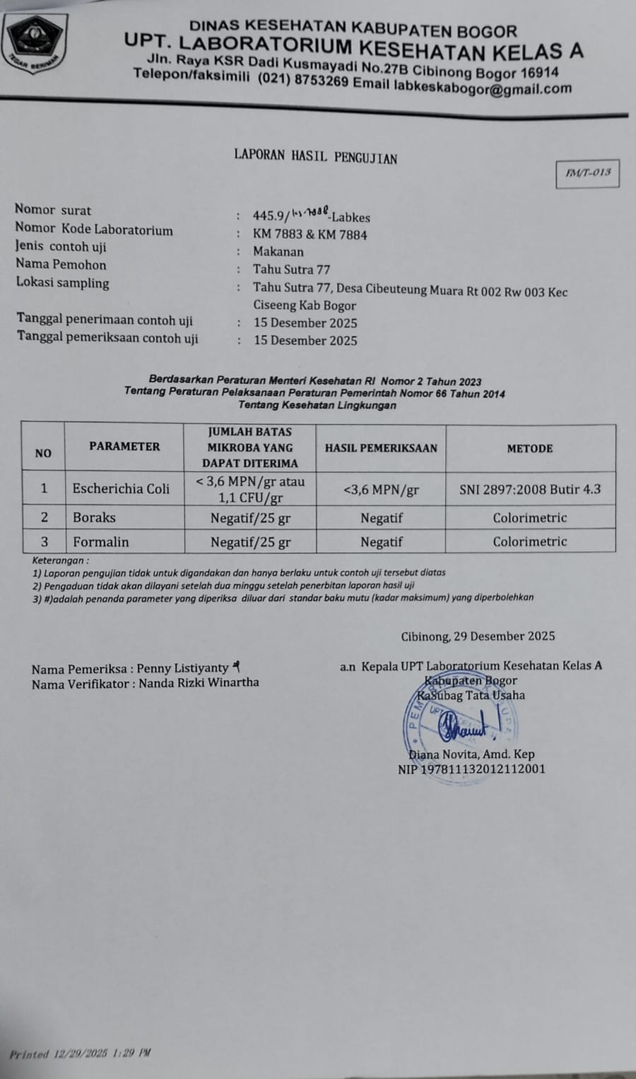 Tenaga Sanitasi Lingkungan Puskesmas Ciseeng, Dewi Suryatin, AMKL, langsung turun ke Pabrik Tahu Sutra 77 melakukan Inspeksi Kesehatan Lingkungan ( IKL), beberapa bulan yang lalu sebanyak 2 kali kunjungan.